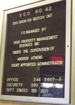 Penny wise and pound foolish —English idiom The corporation had work orders calling for renovations with an estimated cost of $9,600,000. As of the end of 2006, only $73,000 worth of the required work was done. The City of Toronto had issued work orders to YCC #42 covering repair of the balconies and brickwork of each building. Dealing with the corporation's dreadful financial situation and the city work orders was the administrator's first priories. |